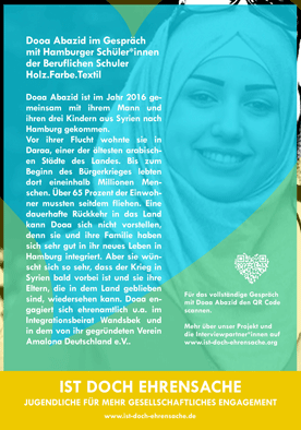 Ab Ende 2021 wird das Projekt "Ist doch Ehrensache" Hamburg weit ausgestellt.Die Ausstellung zeigt Portraits von 20 Ehrenämtler*innen mit Migrationshintergrund, interviewt und fotografiert von Hamburger Schüler*innen, die selbst Migrationshintergrund haben.
